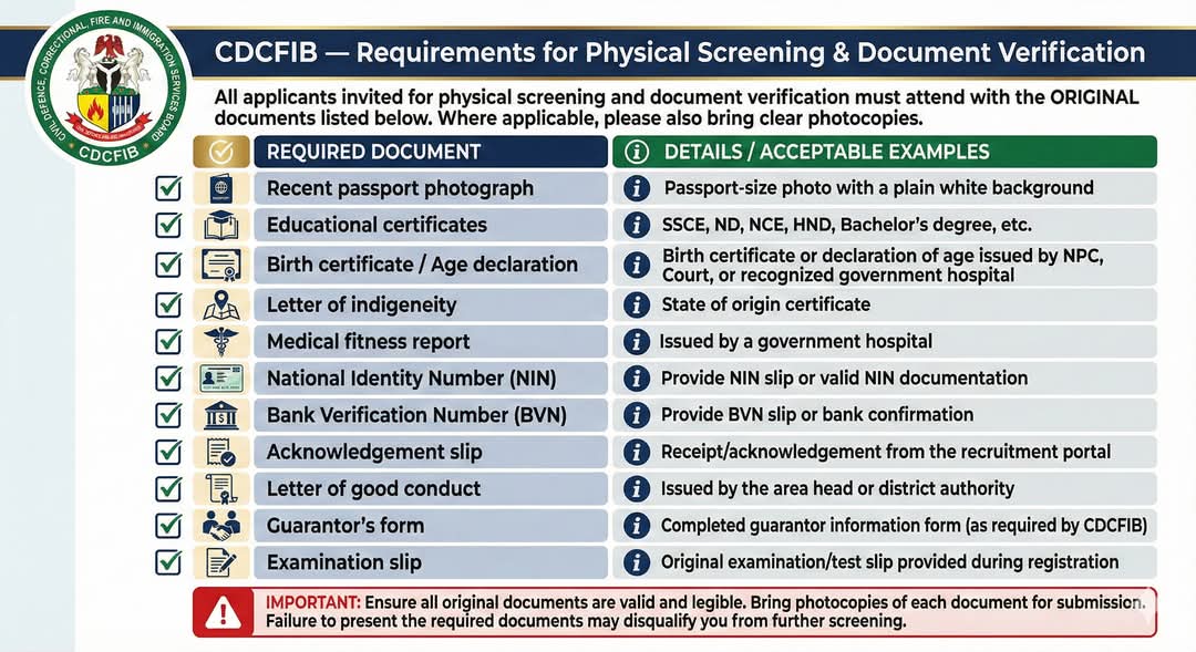 Posted inEducation CDCFIB:- Requirements For Physical Screening & Document Verification Posted by Ibraheem November 27, 2025No Comments CDCFIB:- Requirements For Physical Screening & Document Verification Ibraheem View All Posts Post navigation Previous Post IMPORTANT UPDATE ON CDCFIB RECRUITMENT EXERCISENext PostUniversity of Manchester Humanities Scholarship in UK 2026