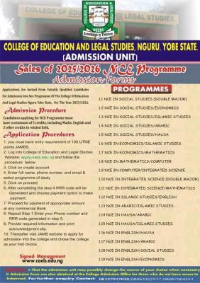 Applications Are Invited From Suitably Qualified Candidates For Admission Into NCE Programme Of The College Of Education And Legal Studies Nguru Yobe State, For The Year 2025/2026.