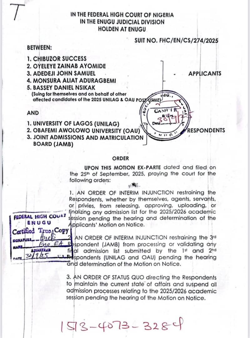 The Federal High Court sitting in Enugu has ordered the University of Lagos (UNILAG), Obafemi Awolowo University (OAU), and the Joint Admissions and Matriculation Board (JAMB) to suspend all admission processes for the 2025/2026 academic session
