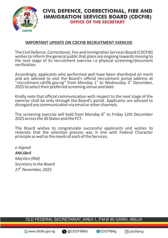 Applicants who performed well have been shortlisted on merit and are advised to visit the Board’s official recruitment portal from Monday 1 to Wednesday 3rd of December 2025 to select their preferred screening venue and date.