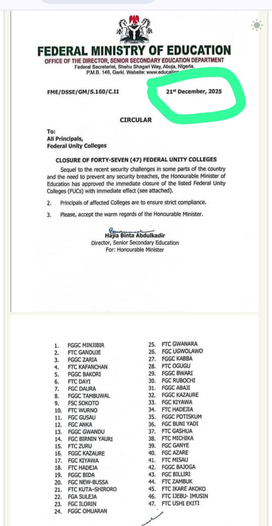 The affected schools are FGGC Minjibir; FGA Suleja; FTC Ganduje; FGGC Zaria; FTC Kafancha; FGGC Bakori; FTC Dayi; FGC Daura; FGGC Tambuwal; FSC Sokoto; FTC Wurno; FGC Gusau; FGC Anka; FGGC Gwandu; FGC Birnin Yauri; FTC Zuru; FGGC Kazaure; FGC Kiyawa; FTC Hadejia; FGGC Bida; FGC New Bussa; and FTC Kuta-Shiroro.