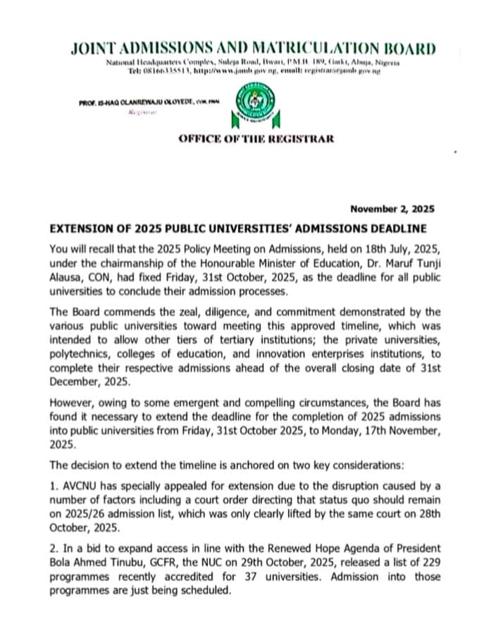 Previous Deadline:Public universities were initially expected to conclude 2025 admissions by Friday, 31st October 2025.