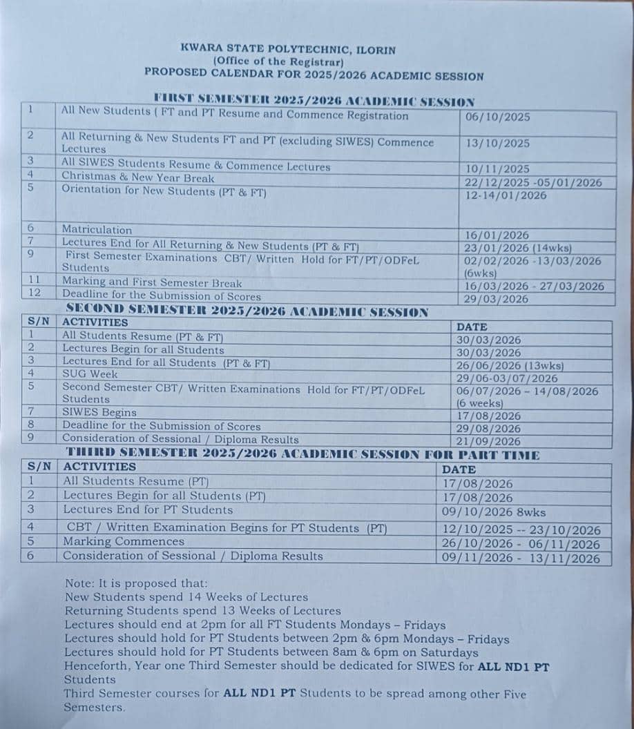 KWARA STATE POLYTECHNIC RELEASES PROPOSED ACADEMIC CALENDAR FOR 2025/2026 SESSION Post navigation UNIUYO School of Basic Studies CBT Screening Exercise, 2025/2026 OBAFEMI AWOLOWO UNIVERSITY RELEASES PROPOSED ACADEMIC CALENDAR