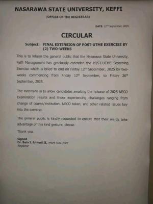 This is to inform the general public that the Nasarawa State University, Keffi Management has graciously extended the POST-UTME Screening Exercise which is billed to end on Friday 12th September, 2025 by two-weeks commencing from Friday 12th September, to Friday 26th September, 2025.