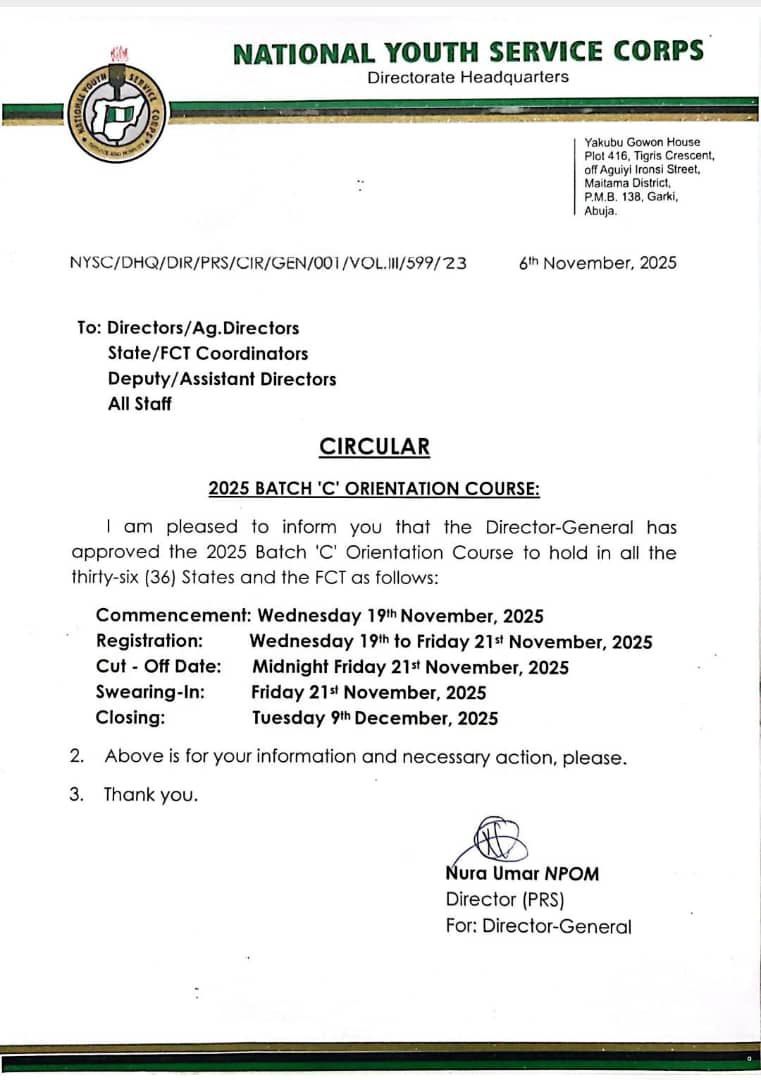 The National Youth Service Corps (NYSC) Directorate Headquarters has officially released the schedule for the 2025 Batch ‘C’ Orientation Course, set to take place across the thirty-six (36) states and the Federal Capital Territory (FCT).
