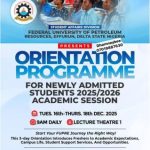The Federal University of Petroleum Resources, Effurun (FUPRE), is delighted to announce and warmly welcome all newly admitted students to the 2025 Orientation Programme, scheduled to take place from Tuesday,…
