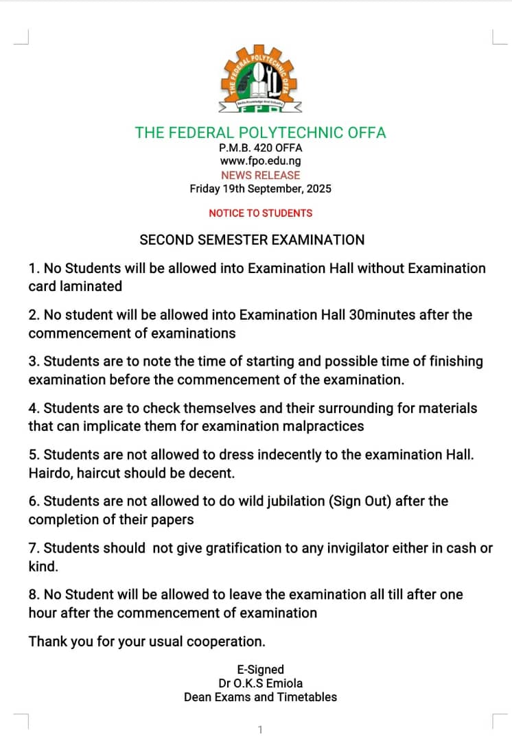 Second Semester Examination Rule and Regulations-Fedpoffa Management Post navigation UNILORIN RELEASES 2025/26 PROPOSED ACADEMIC CALENDAR CALL-UP LETTER FINALLY OUT FOR 2025 BATCH B STREAM II PCMs